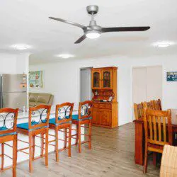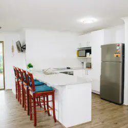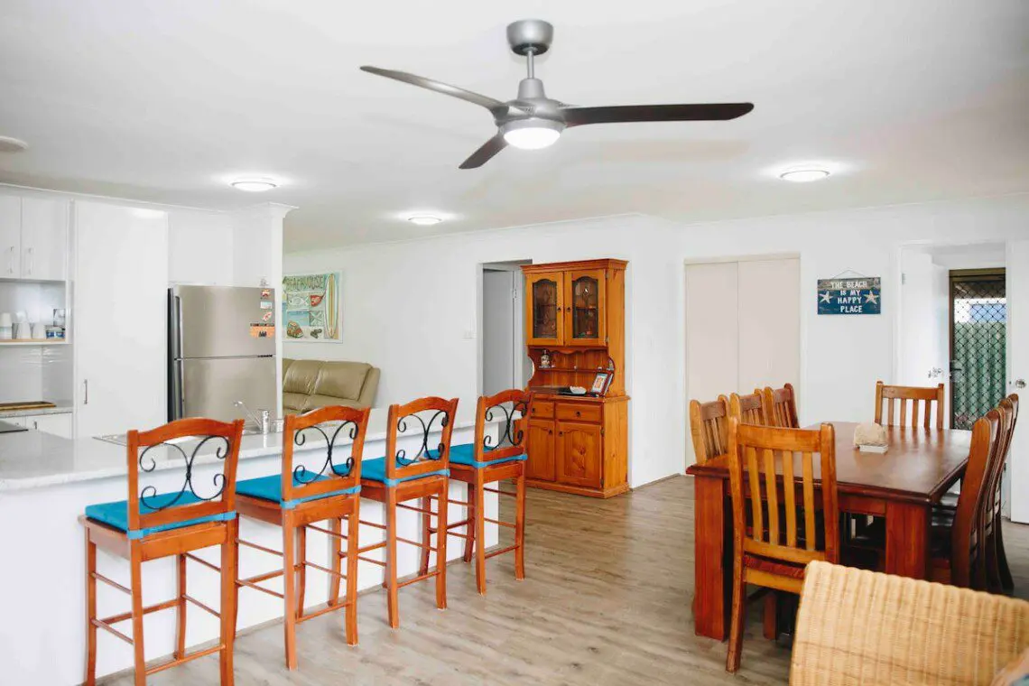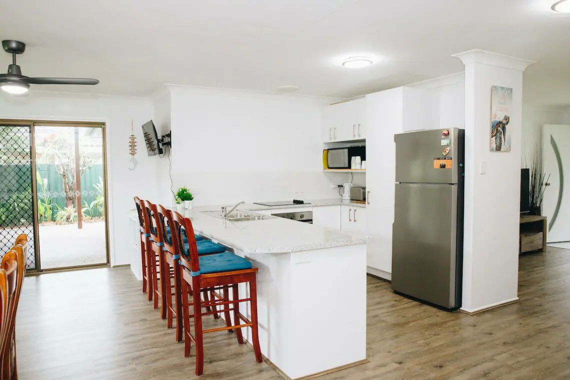 Located just one block away from Warana Beach, this home features an open plan dining and kitchen area, fully equipped with modern appliances and all amenities needed for a comfortable stay. Oven, stove top, microwave, dishwasher, fridge/freezer etc.