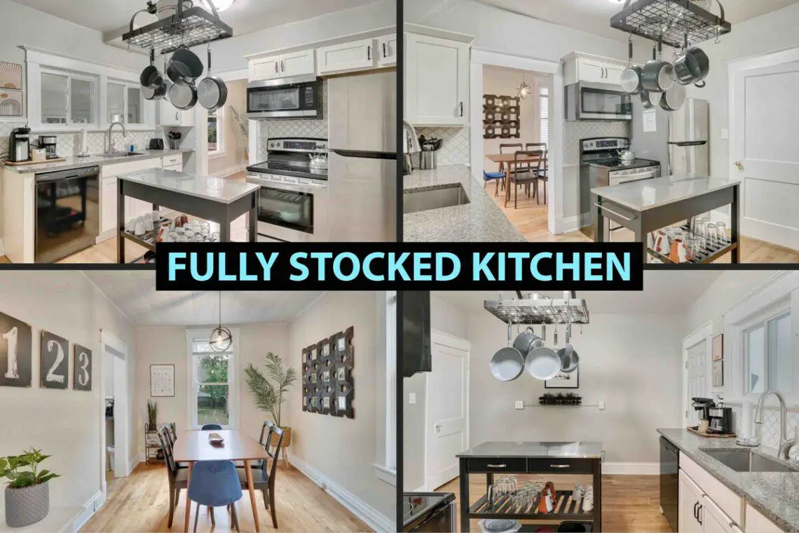 This remodeled modern kitchen has a full-sized oven, stove, fridge, microwave, dishwasher, drip coffee maker, Keurig Coffee Maker, and all of the pots/pans, spices, and cooking oil you’ll need!