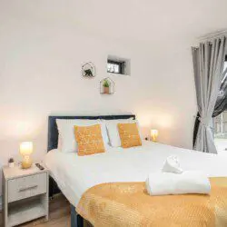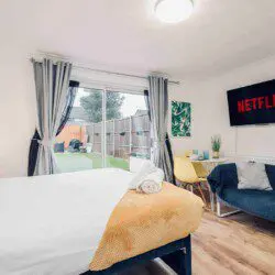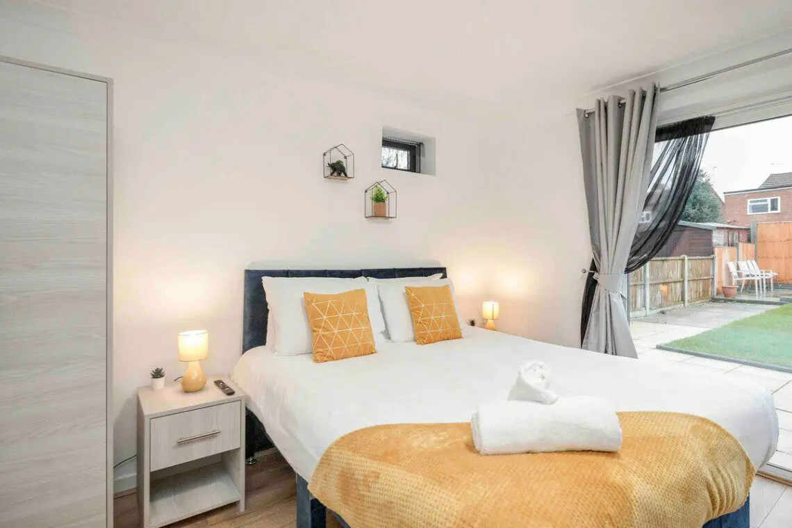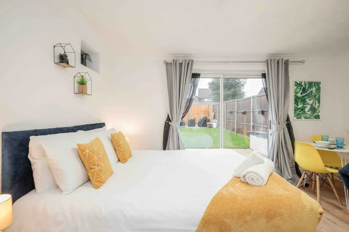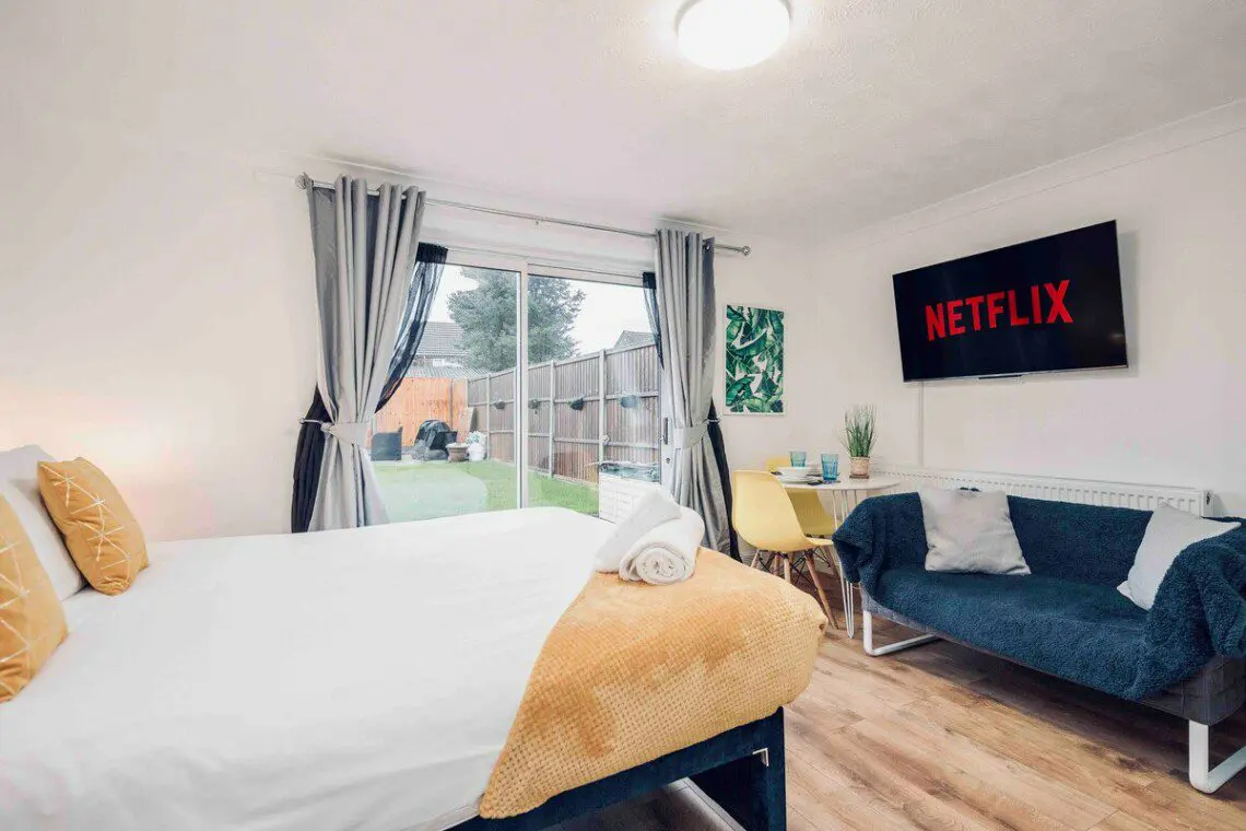 Jesswood Properties are proud to present this bright and cosy, ground floor apartment, with balcony doors that lead out onto a lovely large garden. Free parking & wi-fi . Kitchen with all modern appliances. The beds are zip n link. They are set up as a King size, but can be converted to 2 singles if required.. You can relax with a 50” Flat Screen Smart TV, with Free netfllix. Fantastic location and just a stones throw from Luton Airport