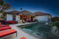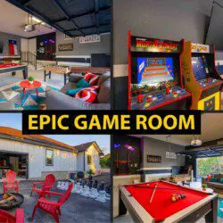 There are 2 large living areas – The first is elegant with an open living concept that flows into the kitchen area + a Huge Flat Screen TV and luxury couches so you can enjoy the game!  The other living room is where the competitive juices will kick in – Pool Table, Foosball, Dart Board, Skeeball + Mortal Kombat II, Pac Man!  The converted garage opens up to allow for the group to play Giant Jenga & Cornhole while still keeping an eye on the fun inside!