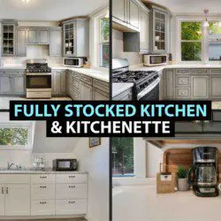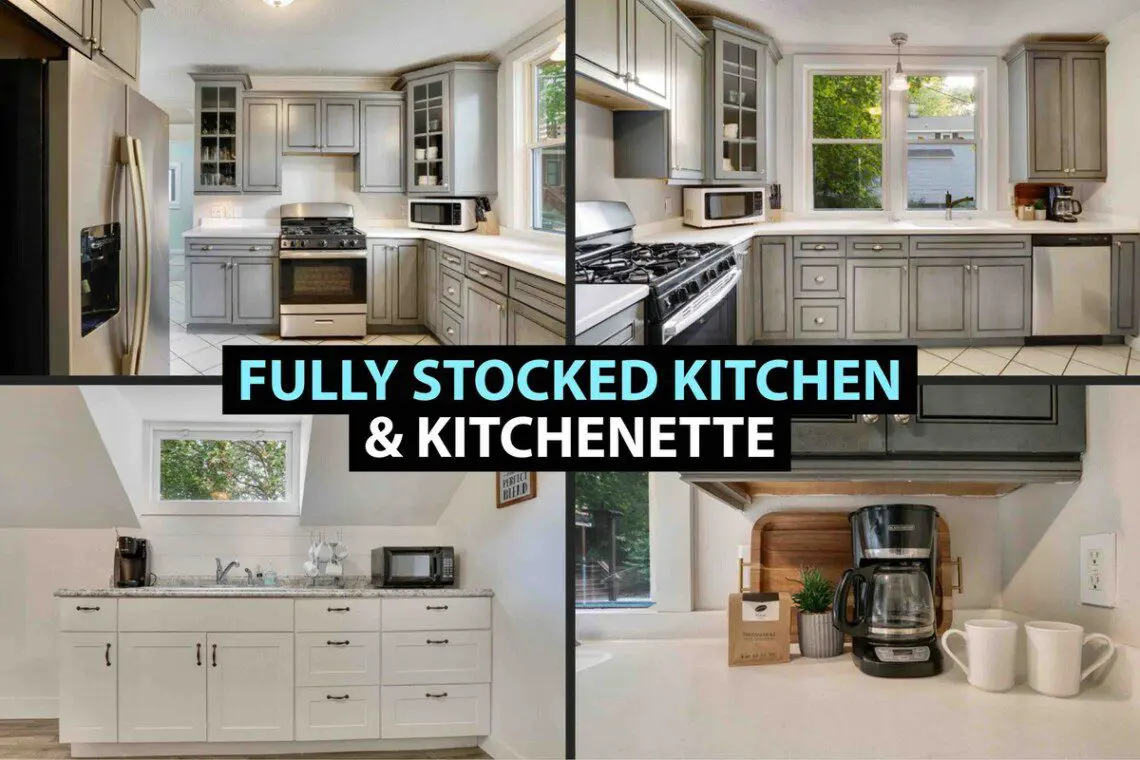 Downstairs is a modern kitchen with a full-sized oven, stove, fridge, microwave, dishwasher, drip coffee maker and all of the pots/pans, spices, and cooking oil you’ll need! There is also a ton of storage space for your groceries so you won’t need to leave anything out on the counter.