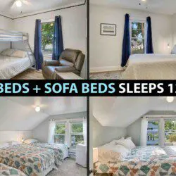 There are 2 living areas – both with large Smart TVs and comfortable couches. The downstairs living area has a ton of room and leads into the dining room. The upstairs living room features a very comfortable sleeper sofa and leads into the upstairs kitchenette area.