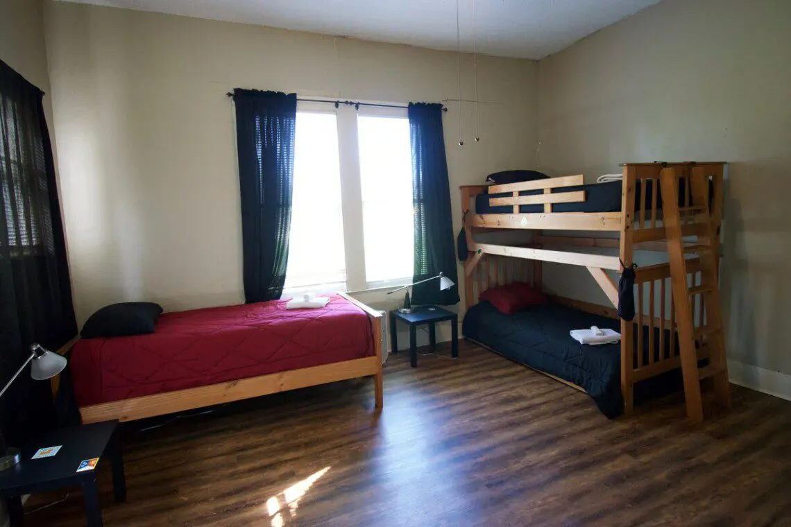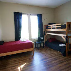 Mixed dorm room with 3 bunks beds that are typically occupied by men. Cajun Hostel Downtown’s 3-bed dormitory is a shared living space with a private exterior entrance and a full adjoining bathroom.
