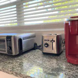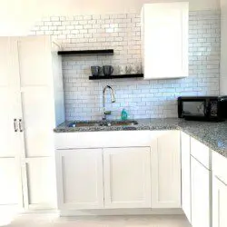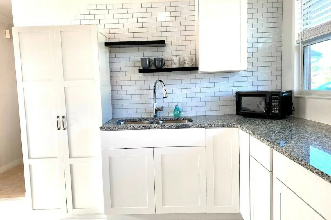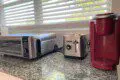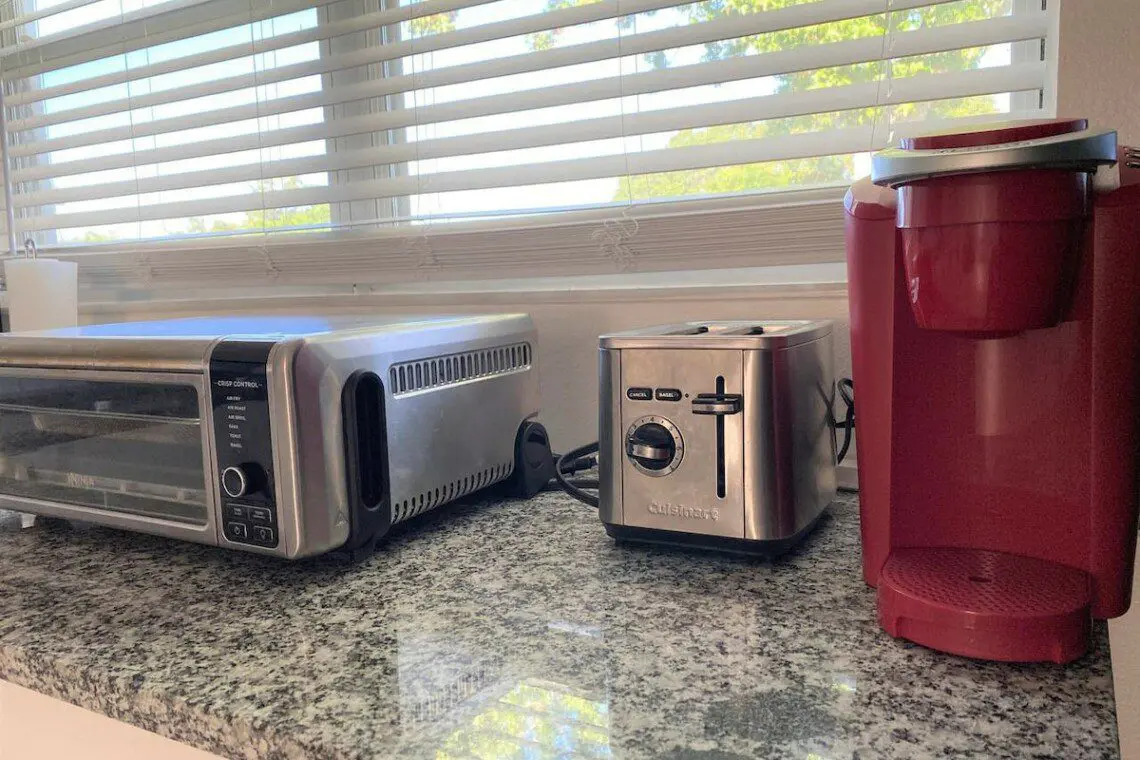 The kitchen does not have a full oven/stove. Instead there is an electric burner and a countertop oven that fits a small pizza. There is also an outdoor gas grill.