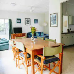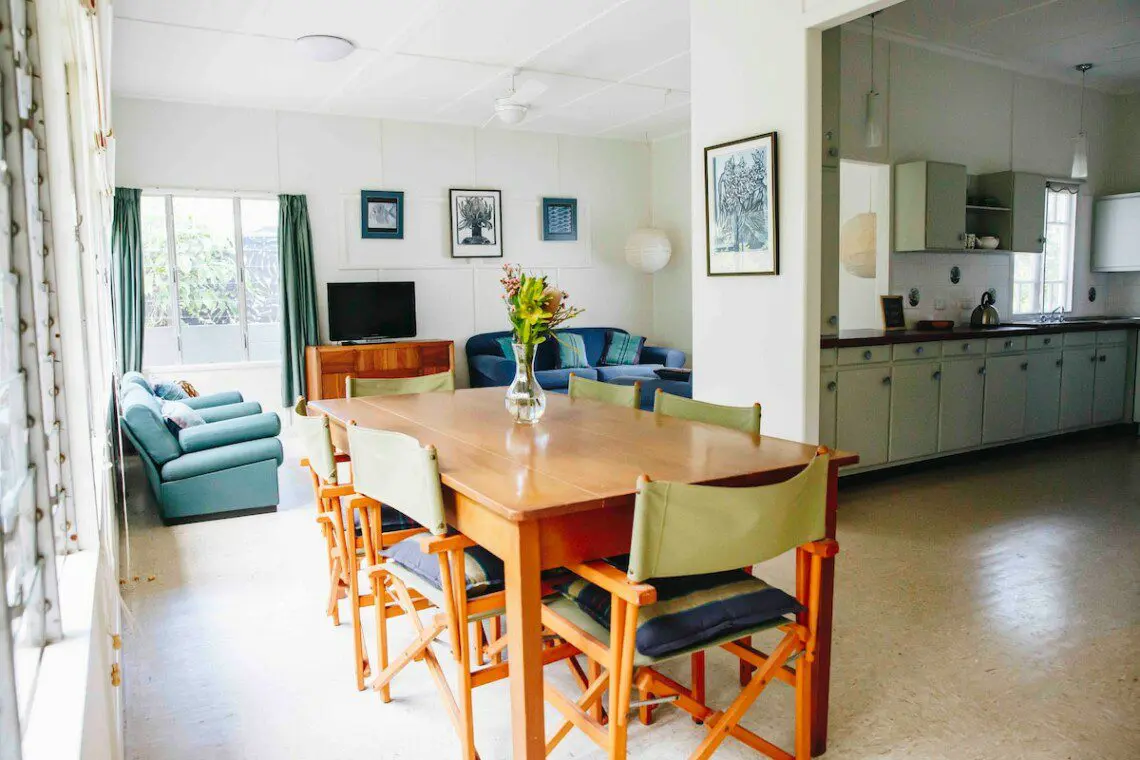 This beautiful character beach house is spacious inside and out and has a well equipped kitchen for cooking and baking family meals. The large dining table seats 8 comfortably.