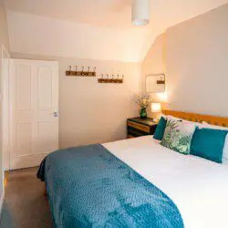 Double bedroom with king sized bed, chest of drawers and hooks to hang your clothes