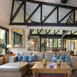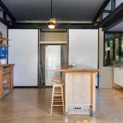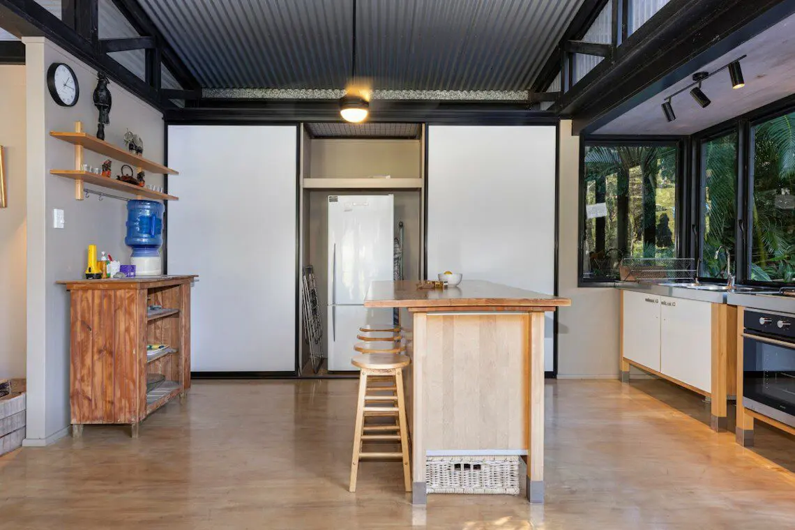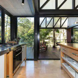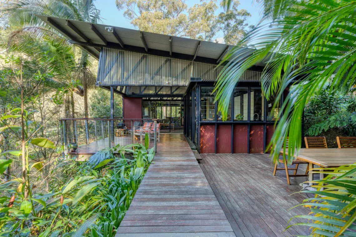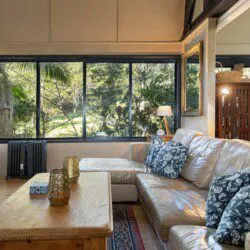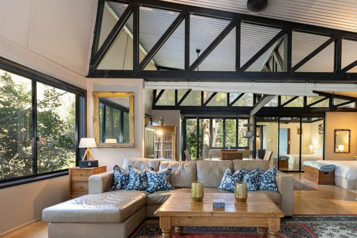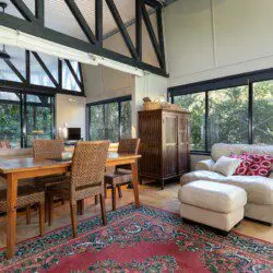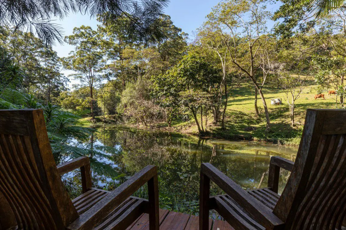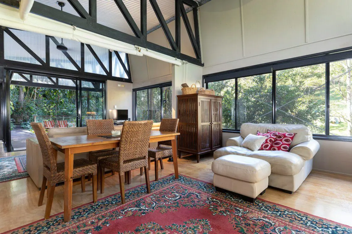 Architectural bright & airy Studio Retreat, beside a creek with wide billabongs – steep cow paddocks opposite – Rainforest surrounds.