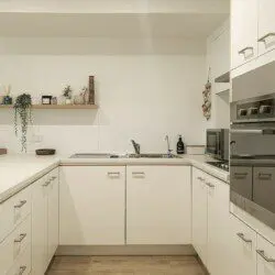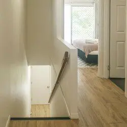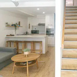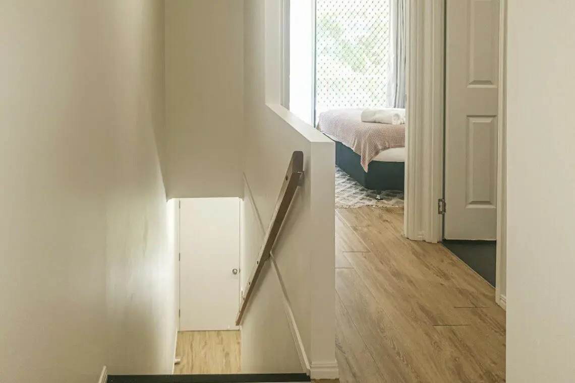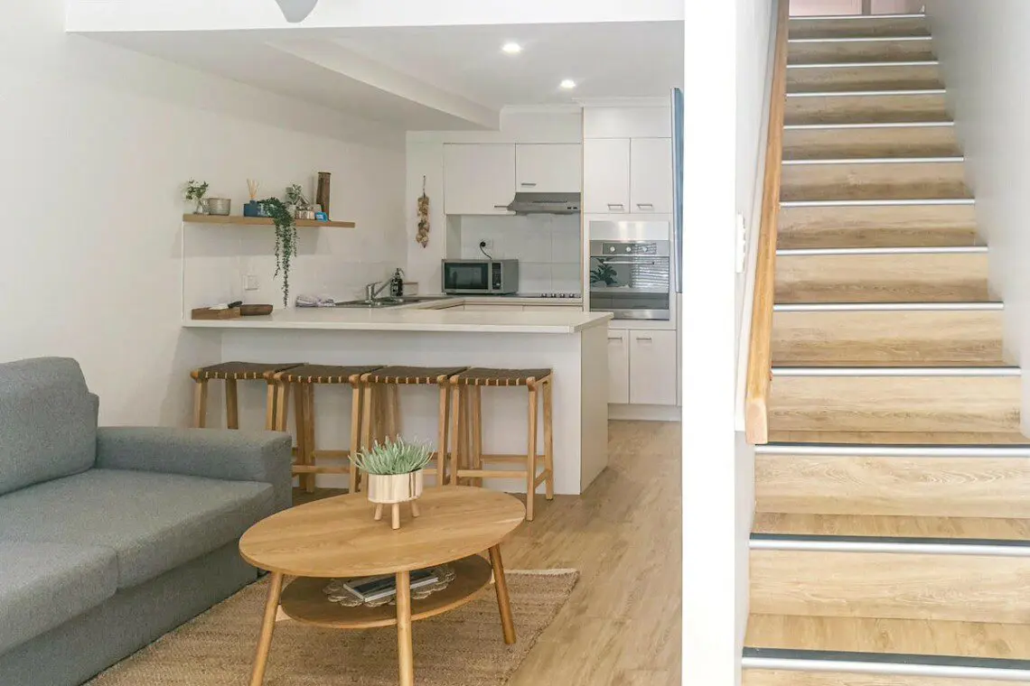Spaced out over two levels, with the ground floor offering the living area and full kitchen including an oven, stovetop and microwave. Also located on this level is one of the bathrooms/laundry with a washing machine and dryer.