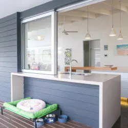 The eastern deck runs the length of the living room with an outdoor BBQ area that merges with the indoor kitchen when the wall of sliding glass is opened. Here you can entertain family and friends while watching the children play in the sparkling in ground pool.