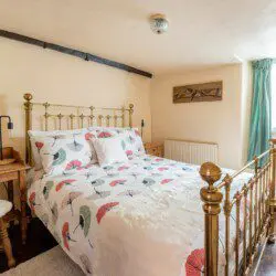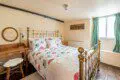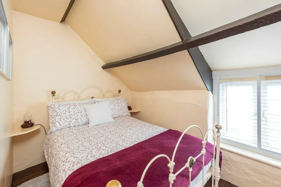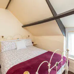 Bedroom with cast iron double bed, bathroom with bath and shower attachment, basin and WC.