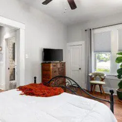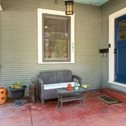 Located on a convenient corner lot, our King William Bungalow offers a comfortable living room with a flat screen television that leads into the dining room. The well-equipped kitchen has been restored with vintage pieces and modern conveniences. The principal bedroom has a flat screen television and bathroom with a double vanity and shower. The hallway bathroom has a tub and single vanity. Guests can do a quick load of laundry using the front-load washer and dryer. Open the kitchen’s French doors and enjoy your morning coffee or favorite evening cocktail on the bistro table under the canopy covered porch. A fenced backyard with a gas grill and chiminea provides guests al fresco enjoyment.