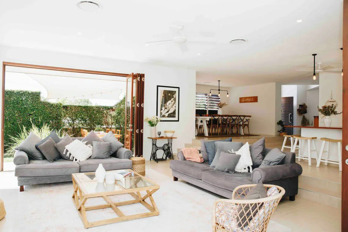 On the main level are 4 spacious bedrooms, with a capacity of 9 adults, or up to 11 with kids. The master suite overlooks the glistening pool, has an inviting King bed and boasts a large walk-thru robe leading to the ensuite. Bedrooms 2 and 3 both have Queen beds. Bedroom 4 has a double-bunk bed and a single with trundle that can combine to be a queen; we recommend max 3 adults in this room or up to 5 children. A travel cot is also available. There are 2 full bathrooms and separate toilet that service this level.