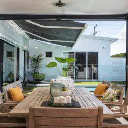 Outside space has artificial turf surrounding pool area and outdoor shower to wash off the sand from beach!