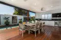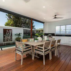 Glass sliding doors that open wide from the living area, creating a seamless transition from inside to out. The timber decked alfresco dining area features an outdoor kitchen with built-in Weber BBQ, two-door bar fridge and sink…