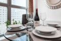 The open plan living room is the first place that you will see once you enter, it has a very comfortable sofa with soft cushions, oval center table, floor lamp, wall mounted flat screen TV, and sound bar. The elegant dining table is set up beside the window.
