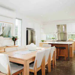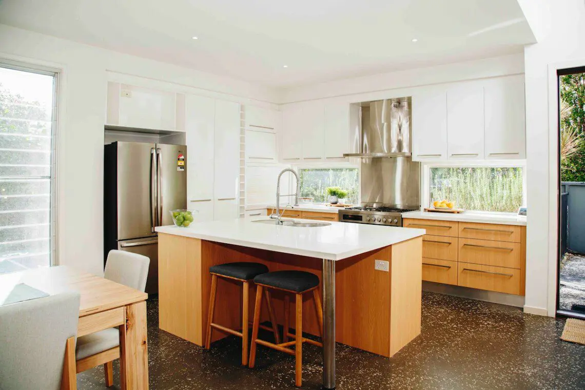 The open plan kitchen serves as the hub of the home, overlooking the indoor and outdoor living/dining areas; perfect for entertaining family after a day at the beach. Fully equipped with modern appliances including gas cooking with a huge stove top, oven, fridge/freezer, dishwasher, microwave, coffee plunger! All basic condiments such as tea, coffee, sugar, salt, pepper, oil, paper towels, etc. are all provided!