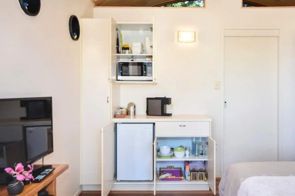 Your own private entrance leads you into the main space featuring a Queen size bed, sitting area with TV and kitchenette equipped with mini fridge, microwave and all the basic kitchen essentials needed. There is also an electric egg cooker for boiled eggs. The bathroom has a full shower, toilet, and a beautiful wooden vanity with sink.