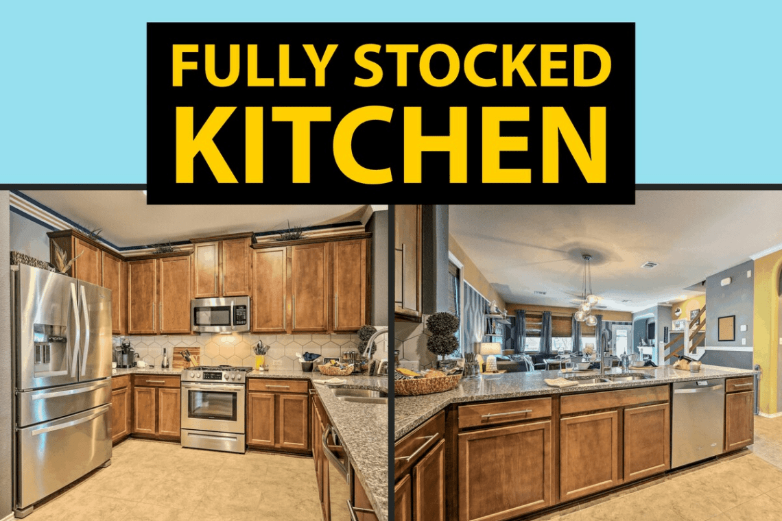 You will have everything you need to make meals for a large group – Modern kitchen with a full-sized oven, stove, fridge, microwave, dishwasher, Kuerig Coffee maker and all of the pots/pans, salt/pepper, olive oil you’ll need!