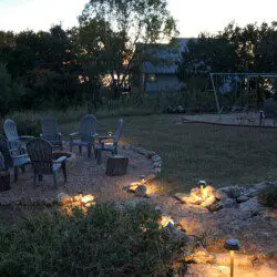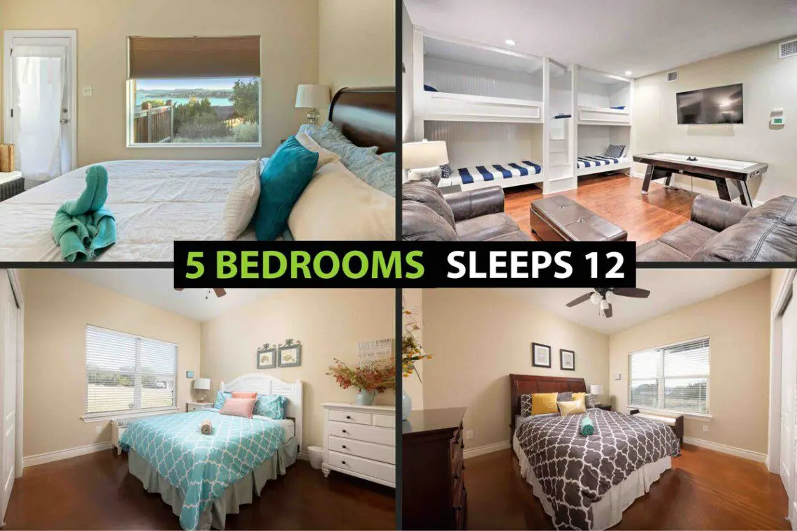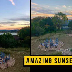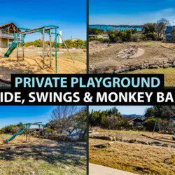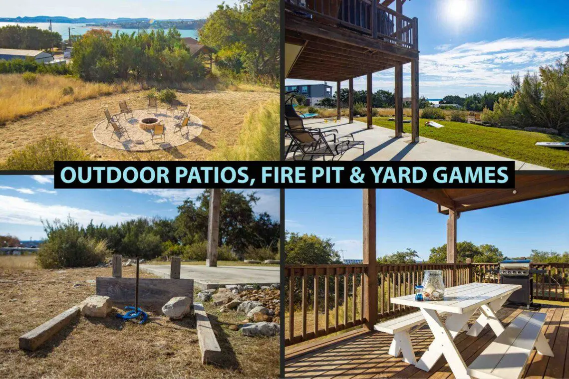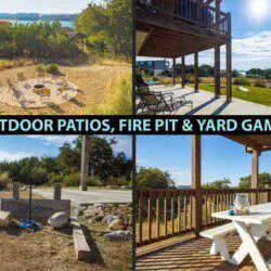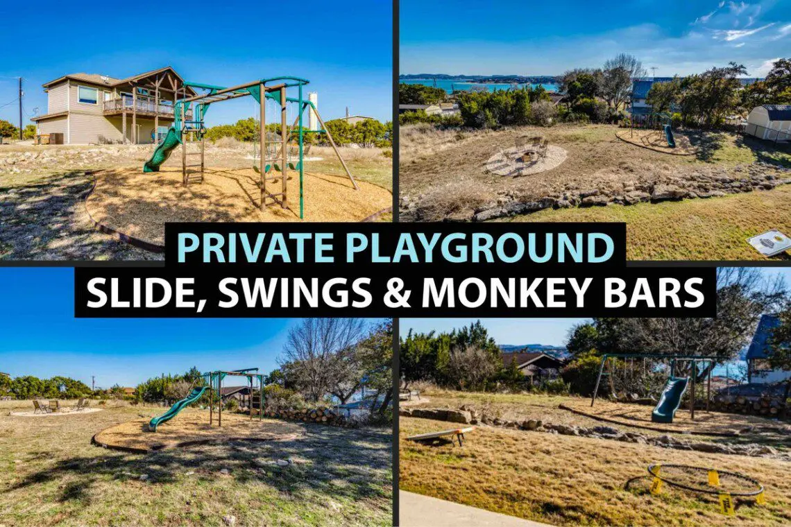 There are 2 large patios that overlook the turquoise waters of Canyon Lake – get ready for some amazing sunsets!  We have a fire pit, several outdoor games (Cornhole, Spikeball, Horseshoes, Disc Golf, a game similar to Pickleball, and more!), and the new addition – an amazing private Playground with slide, monkey bars, and swings!