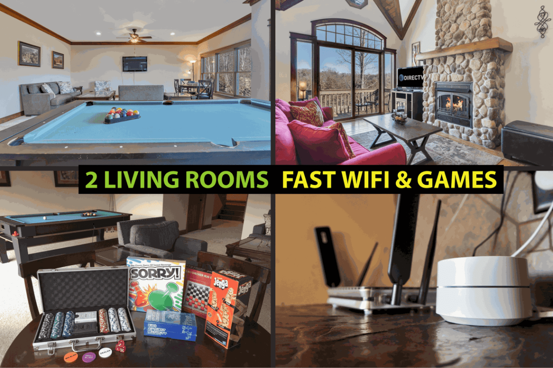 There are 2 large living areas – both with large Smart TVs and comfortable couches.  The downstairs living area has a pool table and poker table (w/ full chip set) as well!
