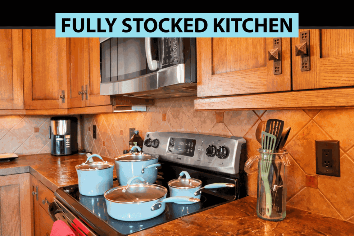 You will have everything you need to make meals for a large group – Modern kitchen with a full-sized oven, stove, fridge, microwave, dishwasher, coffee maker and all of the pots/pans, spices, and cooking oil you’ll need!  We provide Ground Starbucks Coffee for our guests!