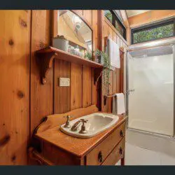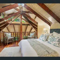 The master room has a comfortable Queen sized bed and is perched on its own level overlooking the living area with an ensuite attached.